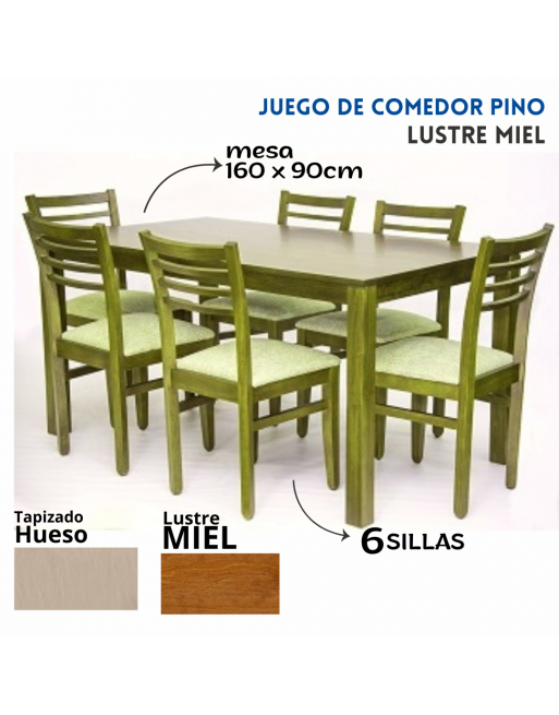 Juego de Comedor Pino. Mesa rectangular 160x90cm, madera de Pino, patas 3x3", lustre Cedro + 6 sillas (S.126) asiento tapizado en Ecocuero Hueso