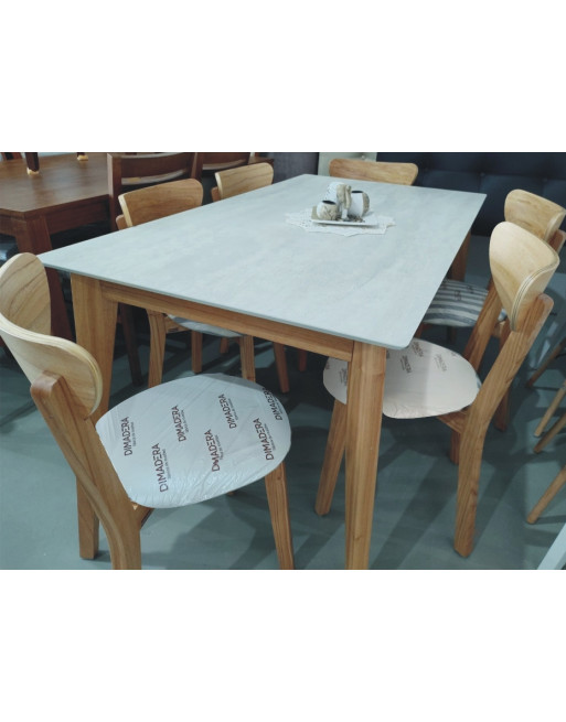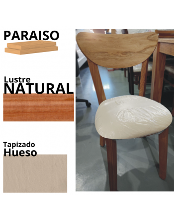 Juego de Comedor Paraiso. Mesa rectangular 160x90cm, Estructura y patas madera de Paraiso lustre Natural y tapa de Melamina color Barrique + 6 sillas (S.110E) asiento tapizado en Tela estampado "Hueso".