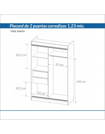 2 puertas corredizas con ruedas inferiores y patines plasticos superiores. 2 cajones interiores. 1 perchero. Medidas: Alto 193cm - Ancho 122cm - Prof. 52cm