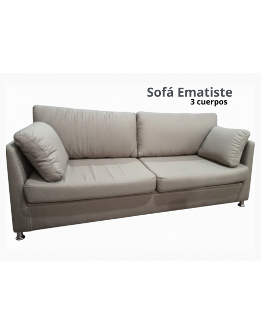 Sofa Ematiste 3 cuerpos. Ancho 220cm. Profundidad 85cm. Tapizado en tela. Patas cromadas. Desenfundable. apoya brazos y respaldo misma altura