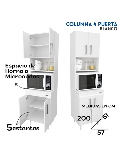 COLUMNA 4 PUERTAS es funcional para organizar tu cocina. Tiene un espacio abierto para poner un Microondas o un Horno Electrico. Ademas del estante a la vista, cuenta con dos estantes interiores (superior e inferior) para guardar utensillos.