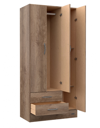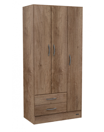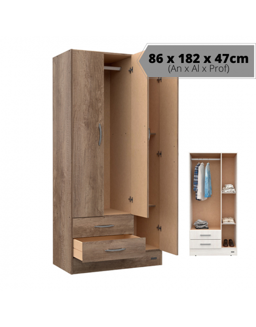 Ropero de 3 puertas batientes. 2 cajones correderas plásticas, perchero y estantes. Melamina 15mm. Exterior de color e Interior crudo. Medidas: Alto 183cm - Ancho 86cm - Prof. 47cm. Color Grei