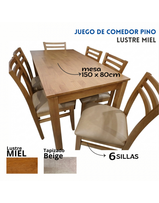 Combo Pino: mesa 150x80 + 6 sillas (127) Miel - Cuerotex Beige