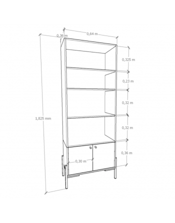 Biblioteca estilo "industrial". Construido en melamina sobre aglomerado de 15 mm. Con estantes divisores. Con 2 puertas bajas de abrir, con bisagras articuladas. Patas de caño. Medidas: 64cm de largo x 183cm de alto x 36cm de profundidad