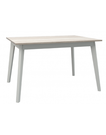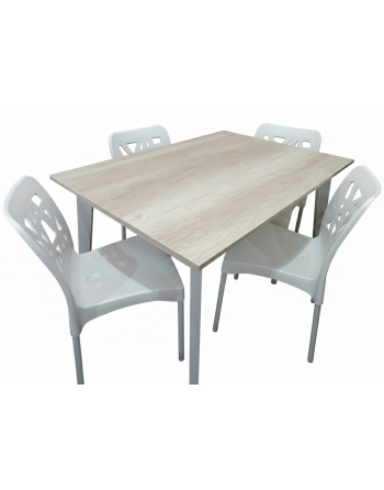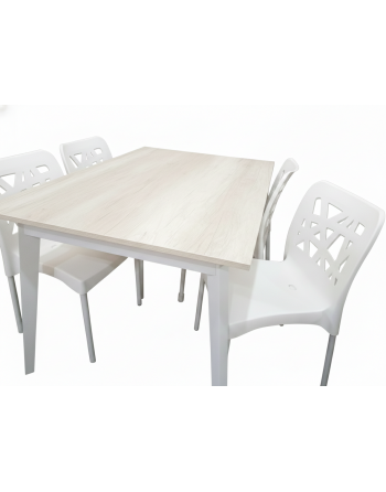 Juego de Comedor. Mesa de 120x80cm tapa de melamina (Helsinki) y patas nórdicas de pino clear lustre Blanco laqueado + 4 sillas (Blancas) de casco plastico y patas de caño pintado blanco.