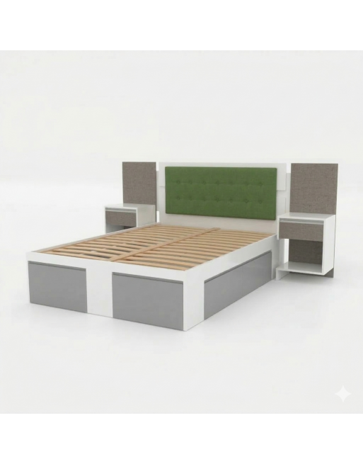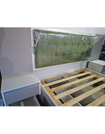 Respaldo Flex regulable 140-160 Blanco-Gris. Extensible 140a160cm - Melamina 18mm. - 2 mesas de luz - tapizado en tela color verde