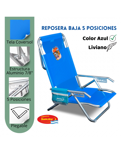 Reposera de playa de cinco posiciones, su cobertura es con telas recubiertas en PVC "solwind". Tubos de aluminio de 7/8". Con bolso porta objetos. Con soporte de apoyo en el respaldo.